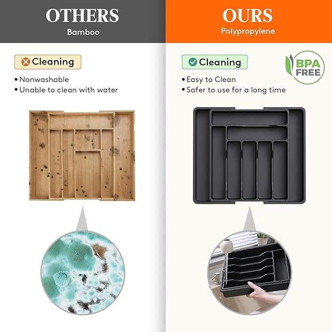 - Premium Construction: The utensil organizer for kitchen drawers is made of BPA-free PP material, ensuring its safety with all types of utensils, silverware and flatware. It has a solid bottom panel with sturdy dividers, keeping your silverware in place.