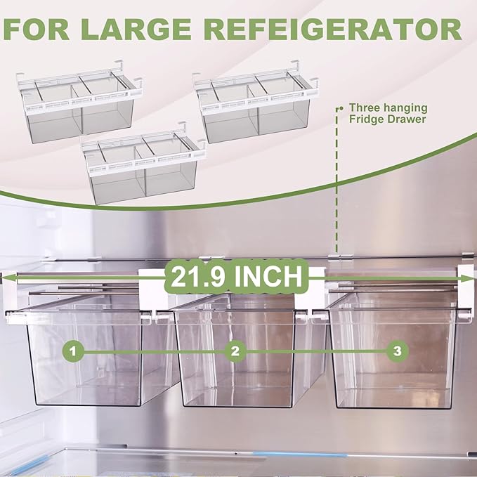 - 【SAPCE SAVER】Easy access hanging pull-out refrigerator drawer organizer save you the trouble of moving all other storage bins. By divided the wasted space, it helps get more space in your refrigerator to organize condiments, deli, cheeses, produce, snack, fruits, vegetables, meats and other food.