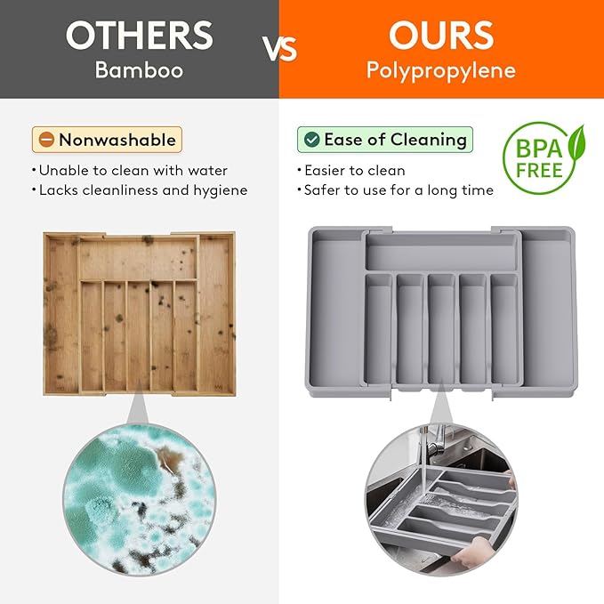 - Premium Material: Made of thick and sturdy premium PP material, the cutlery organizer is BPA free so you can rest assured that it is safe to use with all forms of tableware. The construction means it is built to last for a long time.