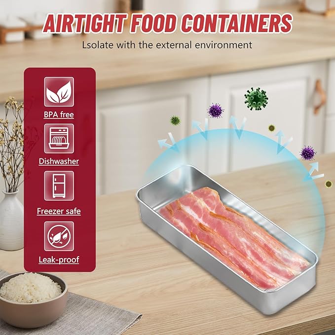 2 Pack Bacon Container for Refrigerator, 304 Stainless Steel Airtight Deli Meat Storage Containers for Fridge Dishwasher Safe Long Kitchen Food Storage Containers with Lids (26.5*10*4.6cm)