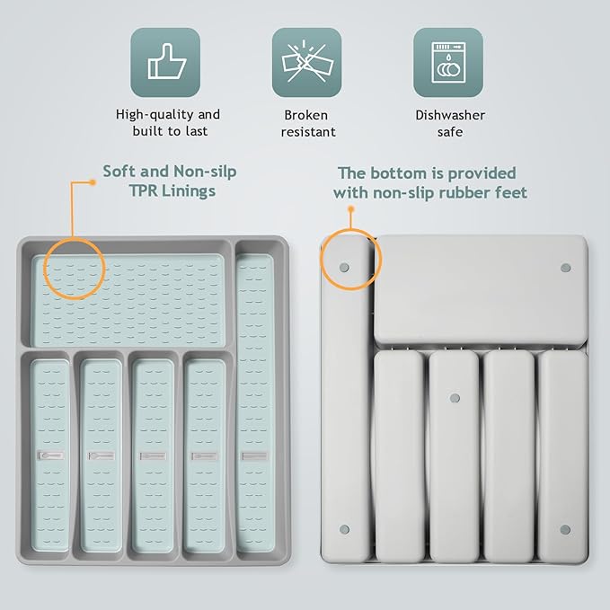 - 6-Compartment Flatware Organizer With Cutlery Icons:Still keeping your cutlery cluttered in your kitchen drawer?This cutlery tray with cutlery icons will really help you!It provides the perfect habitat for knives, forks and spoons and other kitchen necessities, and comes with icons to help you better store and sort,with this you will find that your kitchen drawers will be neat and organized.