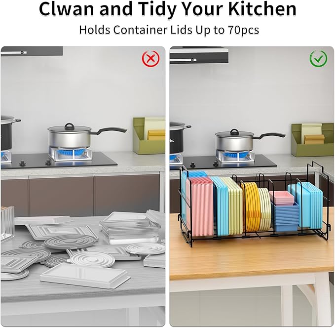 - TIME-SAVING: Well organized your lids can help you grab what you need quickly, no more wasted time in hunting for just the right size lid. You will have them neat, organized and at your fingertips, go and get your home in order with this practical food container lid organizer soon!