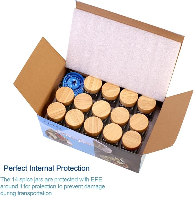 - 【Reliable product packaging】Since glass seasoning bottles are easily damaged by accident during long-distance transportation, to make sure that the spice jars without any damage during transportation,the spices container set is packaged in thick cardboard boxes and shock-absorbing cotton.with this protection, the product is undamaged when you receive it.
