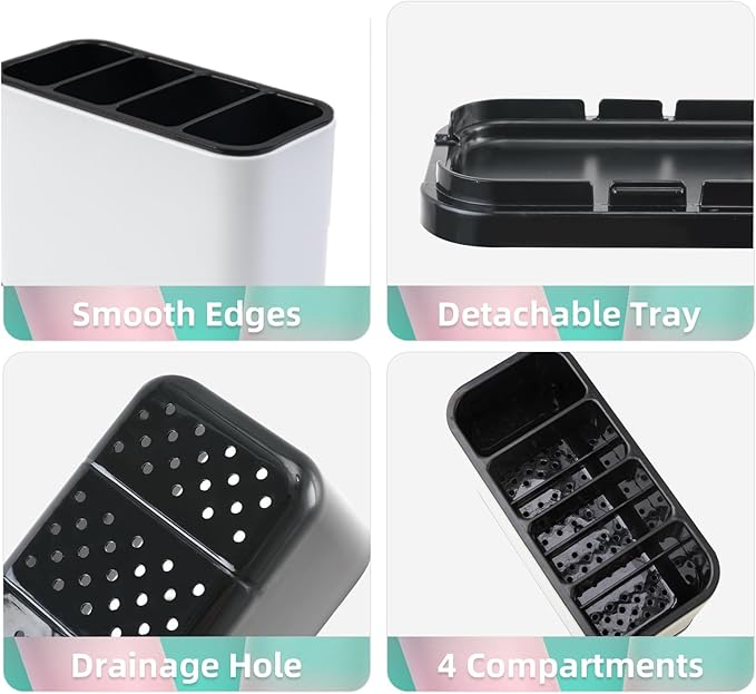 - 4 Divided Compartments: LIBODOUR utensil holder features 4 separate compartments, allowing for the classification of different utensils. The large bottom of the utensil caddy on the kitchen countertop is equipped with sliding rubber pieces to secure utensils and prevent scratching the kitchen surface.