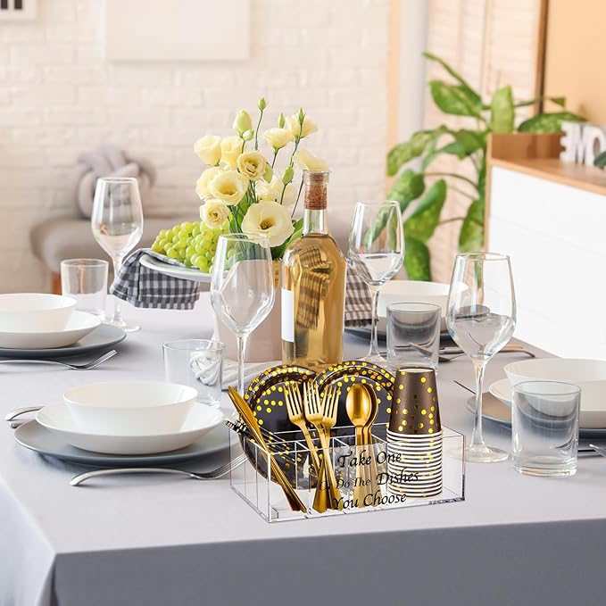 Hushee Utensil Holder Silverware Caddy Acrylic Paper Plate Dispenser Holders for Napkins Flatware Spoon Fork Knife with 6 Compartments for Party Camping Picnic(Funny)