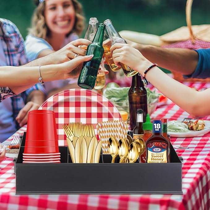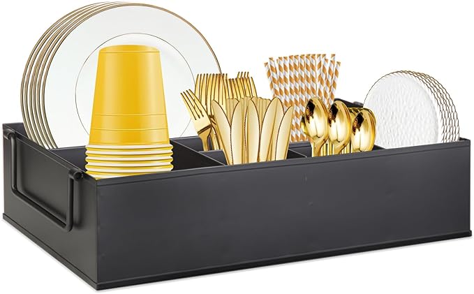 - 7 in 1 Paper Plate Holders:The utensil caddy for plates and utensils with 7 compartments is a great space saver for your kitchen or any Party . It perfectly compatible with 10-inch paper plates, 18oz plastic cups , knives, forks, spoons, napkins and paper plates etc. Divided compartments keep items separated and organized, the open top design of the plate holder also makes it easy to organize and easily access other kitchen accessories.