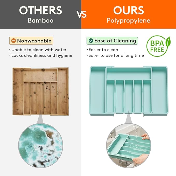 - Premium Material: Made of thick and sturdy premium PP material, the cutlery organizer is BPA free so you can rest assured that it is safe to use with all forms of tableware. The construction means it is built to last for a long time.