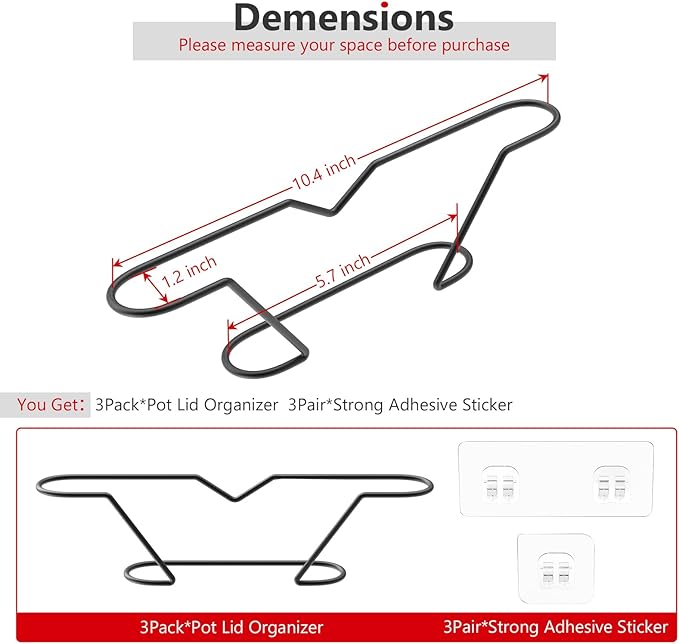 - Nice Warranty: Package Contents of the lid holder include 3* pot lid holders, 3* double-pair adhesive stickers. If you receive the pot lid organizer with missing parts or any quality issues, please do not hesitate to contact us. 24/7 online customer service is available for you.