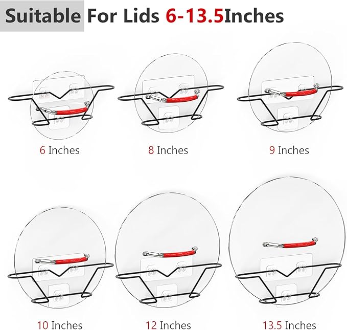 - Suitable Size: Cabinet door pan lid holder is suitable for pot lids ranging from 6 to 13 inches in size. The pot lid rack can accommodate a wide range of handle types, such as rounded handles, ear knobs, and other variations. Super practical kitchen lid organizer worth having.