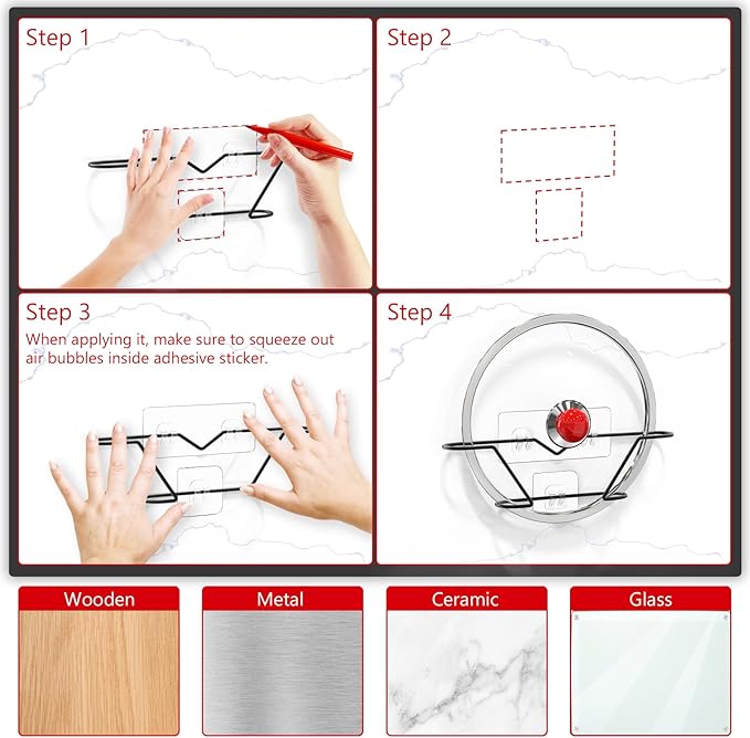 - Damage-Free: The pot lid rack is installed using a no-drilling method, the super strong adhesive sticker does not cause any damage to the cabinet or smooth wall surface, making it useful for rental spaces or situations where you don't want to leave permanent marks.