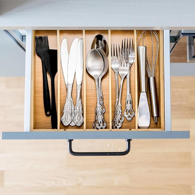 Lyellfe 2 Pack K Cup Holder for Drawers, Bamboo Tea Bag Organizer with Adjustable Dividers, Silverware Utensil Flatware Tray for Coffee Station Home Office, Kitchen