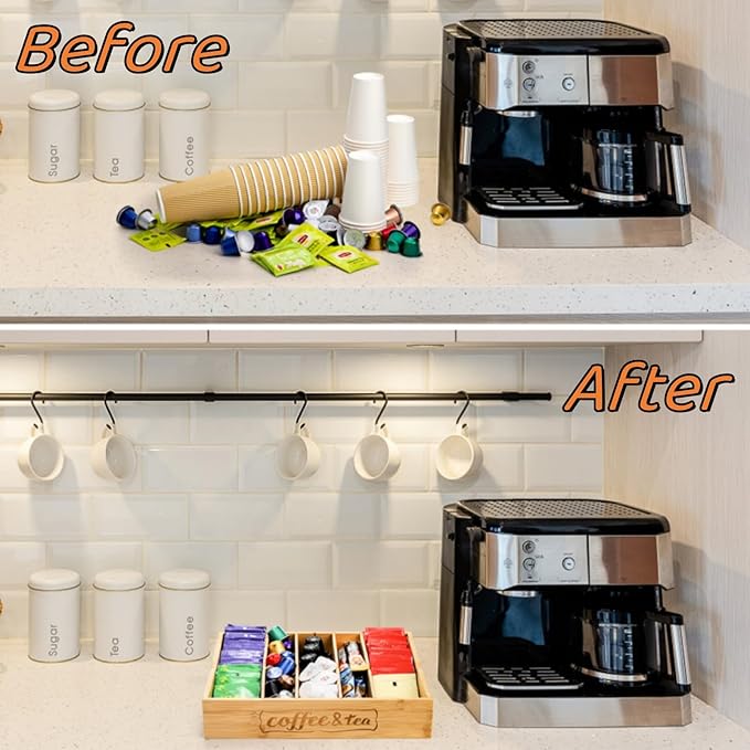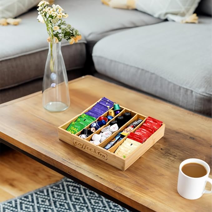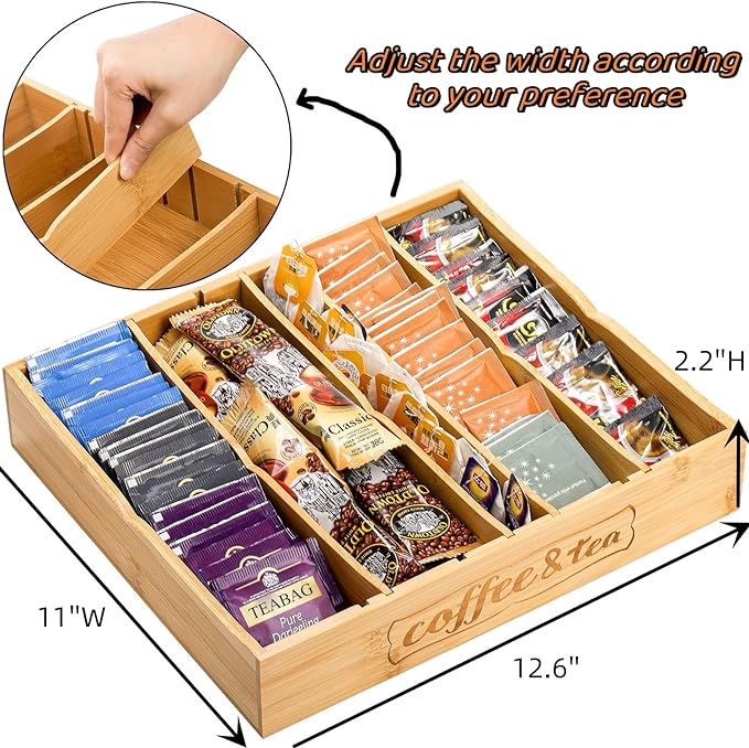 - Versatile Storage Tool: Lyellfe bamboo tea bag organizer is not only suitable for storing all kinds of espresso, bagged tea, sugar, sweeteners, condiments at coffee station, office, but also perfect size for organizing silverware utensil like fork and knife in the kitchen.