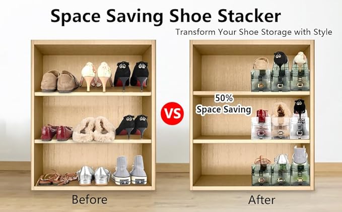 - Boutique Display & Space Saver:The YES!Fresh Shoe Slots Organizer allows for versatile and aesthetically pleasing display options. By placing your shoes in an opposite and declined arrangement, you'll not only showcase your shoe collection beautifully but also add a unique touch to your closet or space. Moreover, the stacked storage helps you save up to 50% of your closet or countertop area.