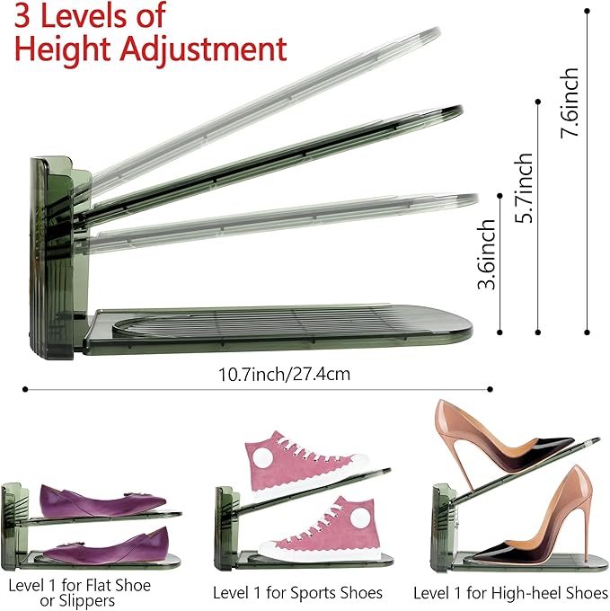 - Adjustable Height: You can adjust the height of the shoe storage organizer according to the size and shape of your shoes. It has 3 levels of height, from 3.4",5.5" to 7.7", to fit different types of shoes e.g. sports shoes, slippers, sandals, flat shoes, high heels. You can also use it to display your shoes at different heights, creating a stylish and elegant look.