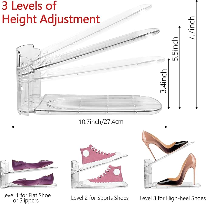 - Adjustable Height: You can adjust the height of the shoe storage organizer according to the size and shape of your shoes. It has 3 levels of height, from 3.4",5.5" to 7.7", to fit different types of shoes e.g. sports shoes, slippers, sandals, flat shoes, high heels. You can also use it to display your shoes at different heights, creating a stylish and elegant look.