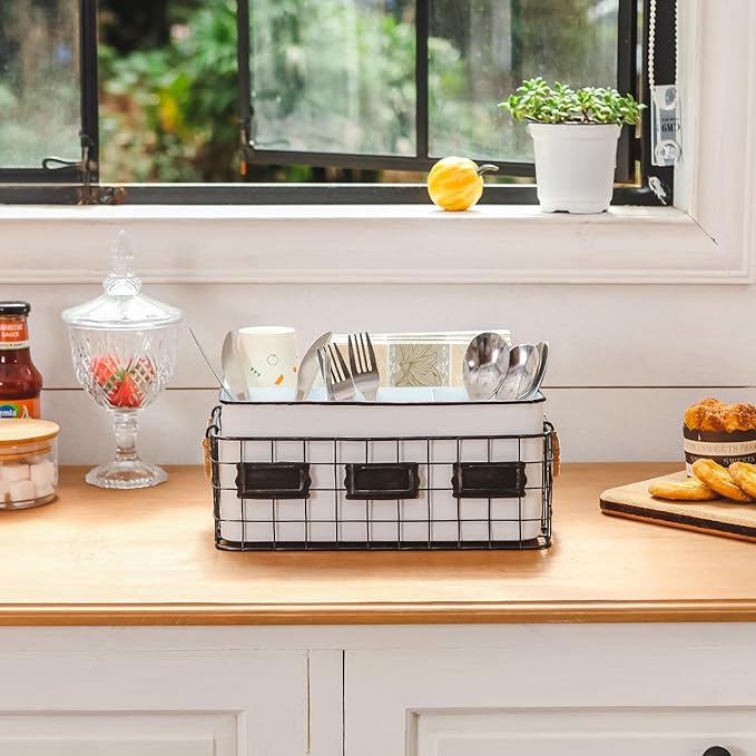 NIKKY HOME Farmhouse Utensil Caddy for Parties, Flatware Holder for Countertop, Rustic Metal Silverware Cutlery Caddy for Kitchen, Dining, Outdoors, Picnics, Parties - White