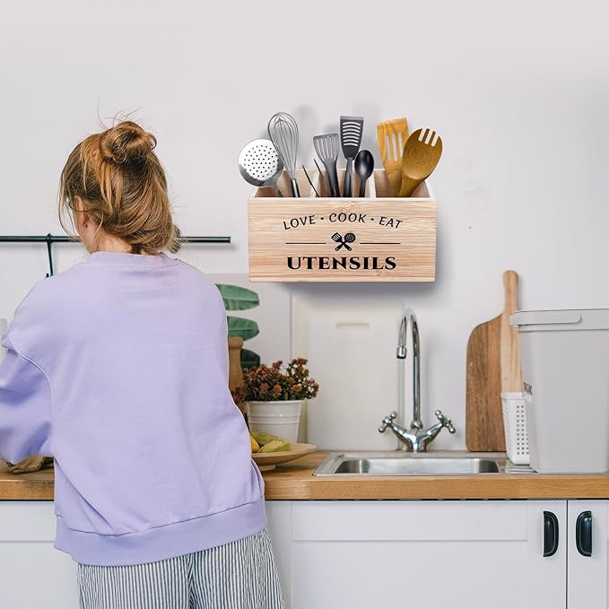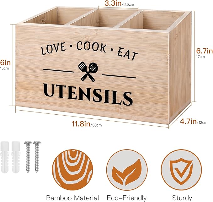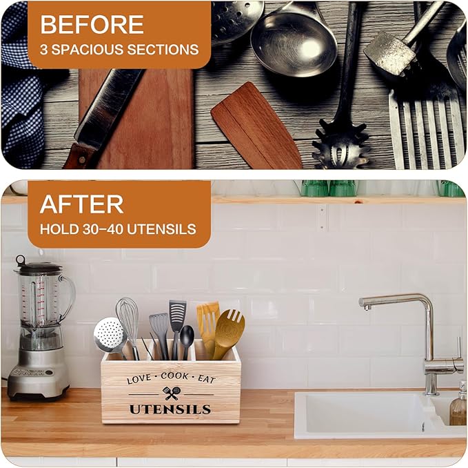 - 【Kitchen Essential Storage Organizer Box】Our farmhouse Utensil Storage Holder made of 100% premium bamboo is more sturdy and durable, 3 compartments designed easy to store various cookware, knives, spatulas, tongs, egg beaters, ladle, Skimmers, peelers, corkscrews, silverware, forks, chopsticks and more, keep your kitchen utensils neatly in place. ***Note: The package is not include any tableware!!!