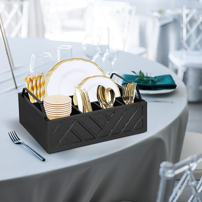 - 【Paper Plate Dispenser with Handles Keep Organized】Our kitchen paper plate holder for counter has 6 compartments, which helps you to separate and organize disposable dishes, spoons, forks, knives, napkins, paper cups, straws. The handles on both sides make this wood utensil caddy easy to carry. And the top open design makes you easily access all dishes or seasonings. Efficiently organize and store your kitchen utensils while saving space for your cabinets or drawers by this silverware caddy.