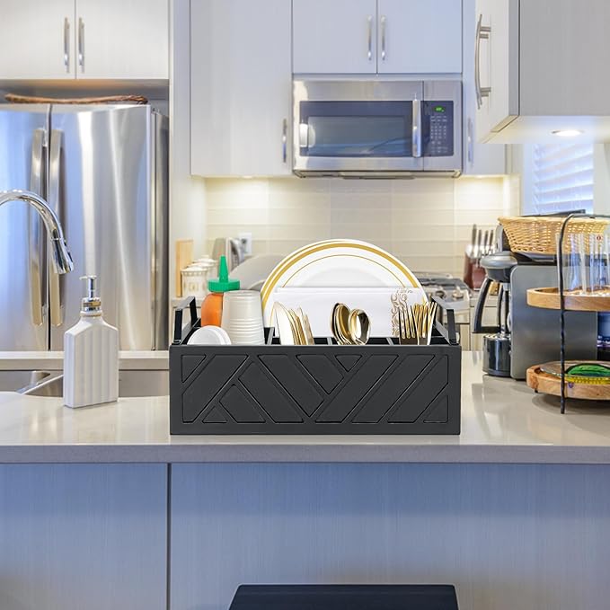 - 【Stylish Paper Plate Holder for Farmhouse Decor】The paper plate organizer are not only practical but also add a touch of elegance to your kitchen. This paper plate and utensil holder caddy with unique carved design and black appearance can elevate the look of any places with its minimalist aesthetic. It’s time to use this stylish utensil organizer caddy to add rustic home decor or modern decor for your home!
