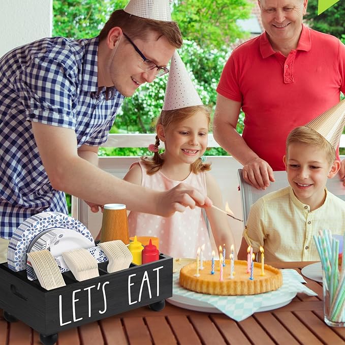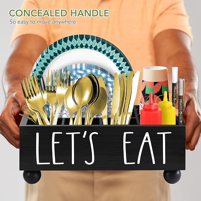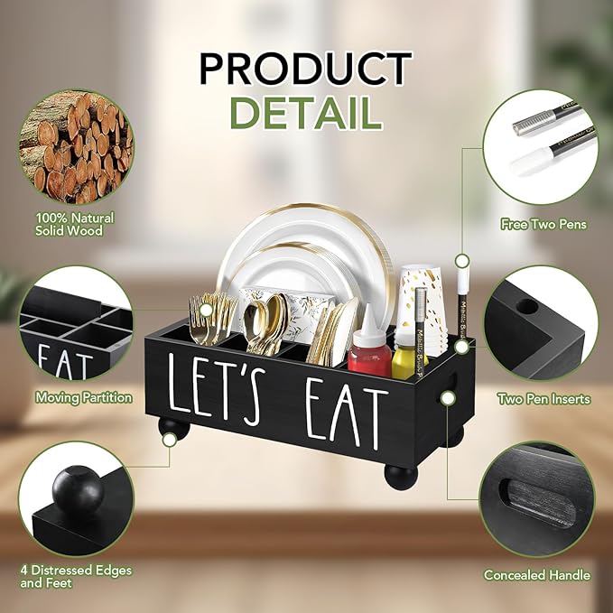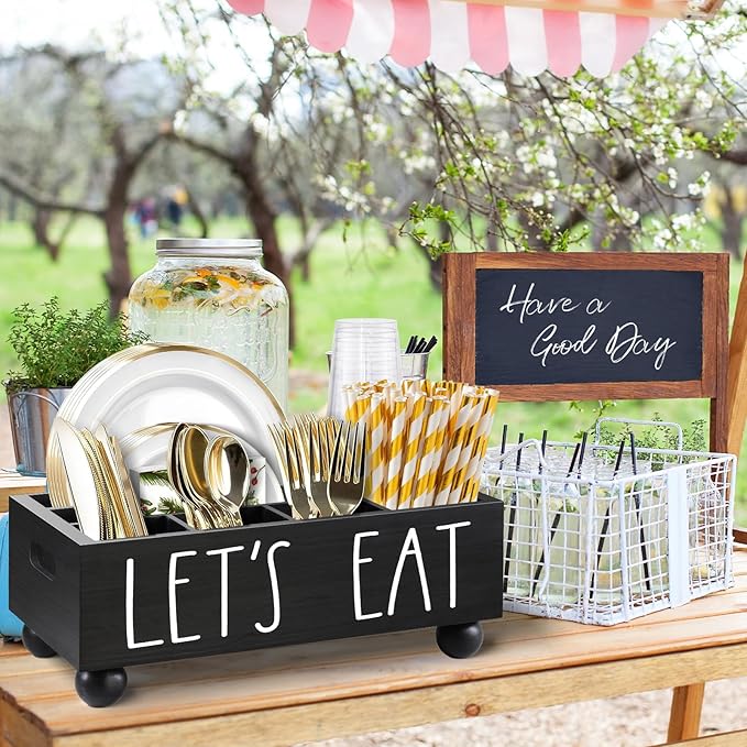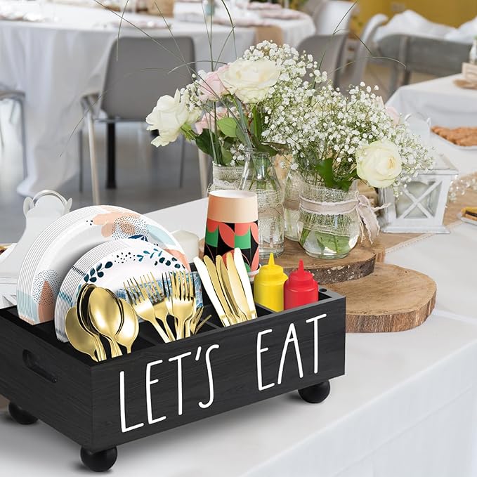 - 【Stylish Utensil Organizer for Farmhouse Decor】 Elevate your kitchen or occasion with the black paper plate holders, crafted from farmhouse-style wood. Its rustic and modern finish adds a touch of sophistication to your home, making it not just a practical storage solution but also a corative piece that complements any setting. Our stylish utensil organizer caddy for party embraces the perfect blend of functionality and style, making every meal and gathering organized and visually appealing.