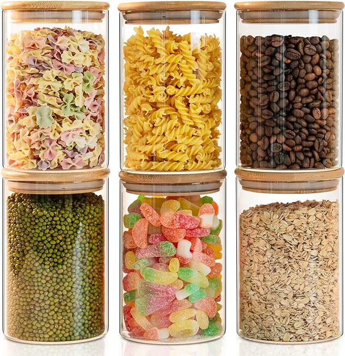 Glass Food Storage Jars 6-Pack 37oz - 4x6 in-Clear Glass Food Canisters with Bamboo Lid Airtight For Serving Tea, Coffee, Flour, Sugar, Candy, Cookie, Spice and More (Circular)