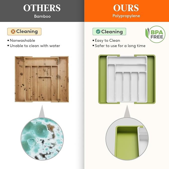 - Premium Construction: The utensil organizer for kitchen drawers is made of BPA-free PP material, ensuring its safety with all types of utensils, silverware and flatware. It has a solid bottom panel with sturdy dividers, keeping your silverware in place.