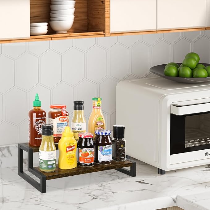 - Quick Setup & Easy Cleaning: With detailed instructions and tools provided, you can have this 2-tier spice rack assembled in 10 minutes. The wooden surface is waterproof and dust free, a damp cloth could keep the spice rack clean.