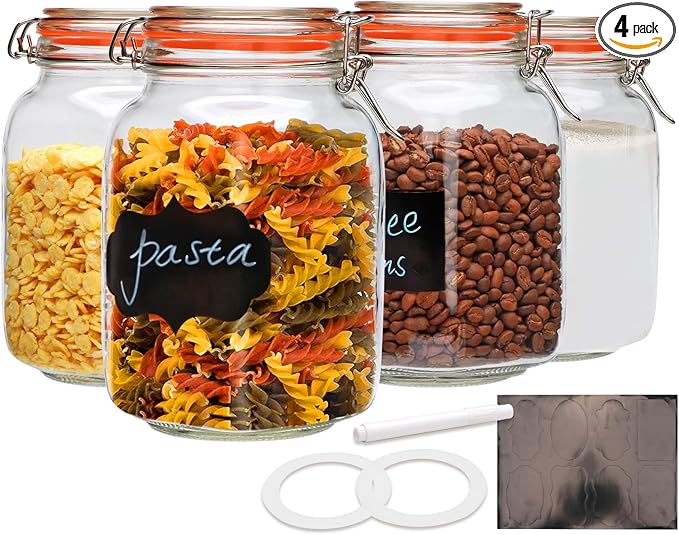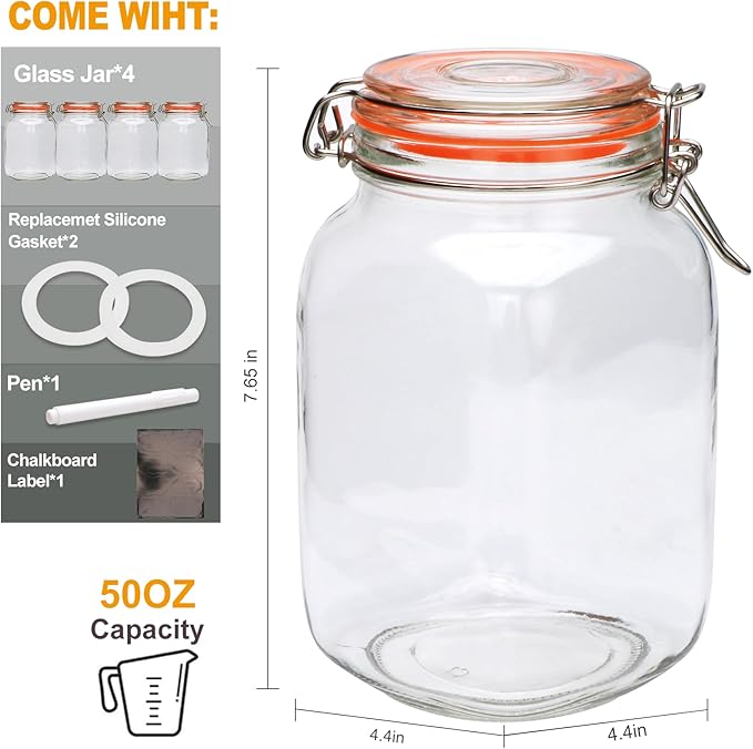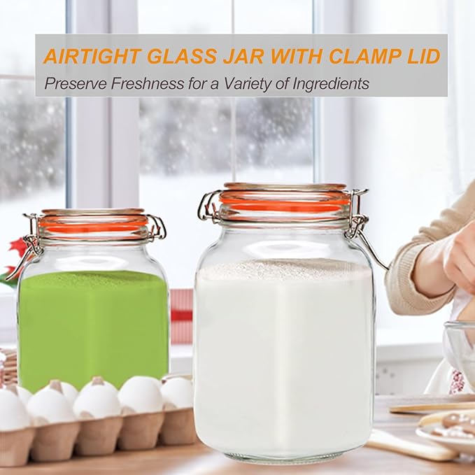 Encheng 50oz Glass Jars with Clamp Lids,Set of 4,1500ml Square Wide Mouth Mason Jars with Airtight Lids,Large Glass Storage Container with Clip Lids for Kitchen,Flour,Pasta,Beans