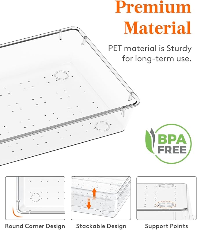 - Efficient Storage: The kitchen drawer organizer set is perfect for sorting and categorizing utensils, including knives, forks, spoons, mixers, corkscrews, bottle openers, or other utensils and tools. They can be neatly arranged side by side in the drawer for easy organization. When not in use, they are stackable, maximizing drawer space utilization.