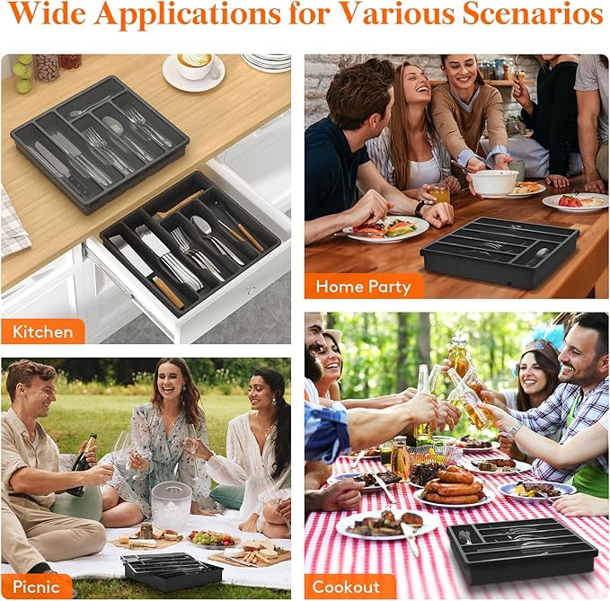 - Portable Design: Our flatware organizer for drawer is versatile and can be used for more than just organizing kitchenware. Its lightweight design makes it ideal for various occasions such as home parties, cookouts, picnics, camping, RV travel, and other outdoor events.