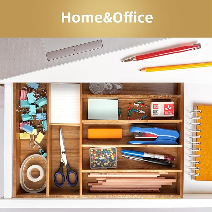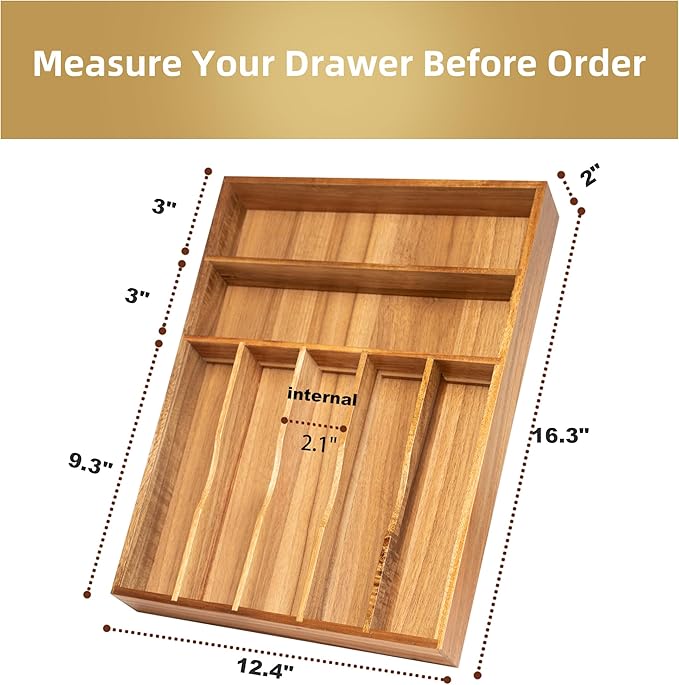 - 【Keep Your Home Tidy】This beautiful 7-compartments cutlery organizer has 2" deep compartments and can be placed into any drawer or desktop, which helps you to see everything at a glance and keep away from messy. The perfect space-saving acacia wood silverware organizer helps you to reach the desired item that you are looking for. Whether you are looking for your favorite knife or spoon, this utensil organizer makes it completely simple. We highly recommend to measure your drawer before order.