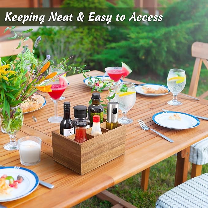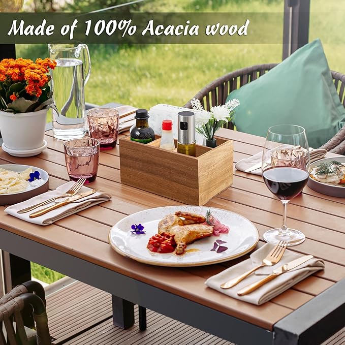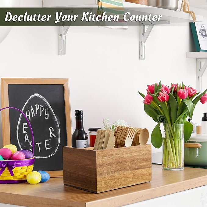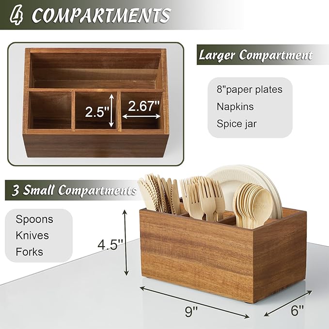 - Handcrafted from Acacia Wood: The silverware holder is handcrafted from acacia wood, each silverware holder you receive is unique, retaining the original texture of the wood (the color of the wood in different regions may also vary)This classic and elegant flatware holder is great for organizing without taking up too much space and has a felt bottom so it won't scratch your counter.Great for summertime backyard events, holiday gatherings