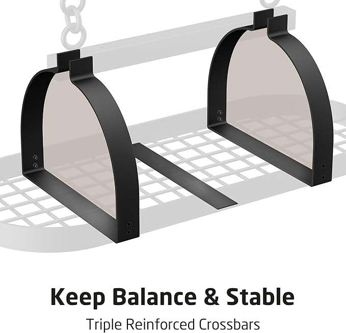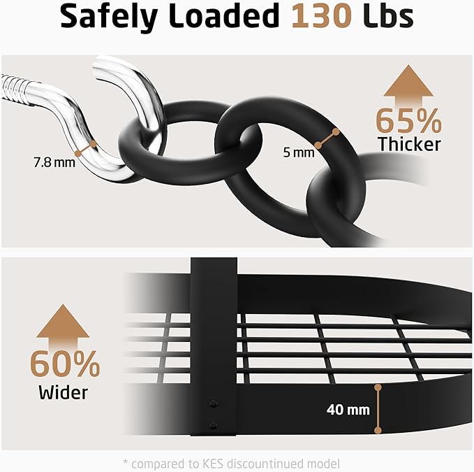 - [Keep Balance & Stable] KES triple reinforced crossbars provide perfect balance for your entire pot and pan hanger, ensuring stability and safety when storing or retrieving even your heaviest cookware.