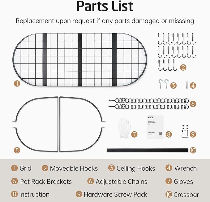 - [Adjustable Chain for 8-10 ft Ceiling] You can easily customize the chains' length to make the ceiling mount pot rack just right for your space.