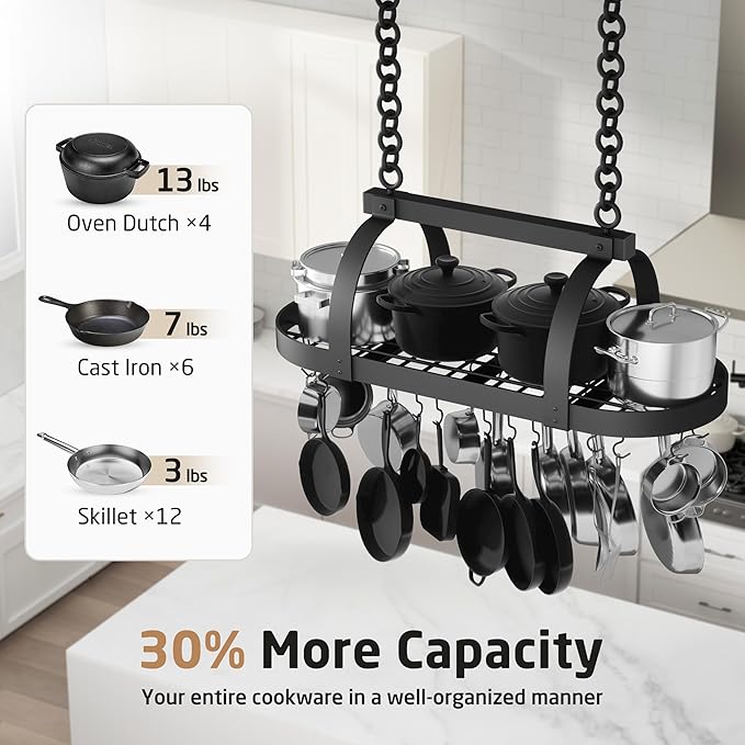 - [Solid & Stronger Chains] With 0.196" thick & solid chains that are 65% thicker than others for greater weight-bearing capacity. You can confidently store your heaviest pots and pans on this heavy-duty pots and pans organizer.