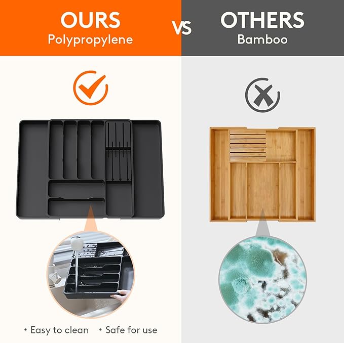 - Premium Durable Material: The flatware organizer for drawer is made of thick and sturdy food-grade PP material, which is BPA-free and non-toxic. You can rest assured that it can be safely used with various types of cutlery.