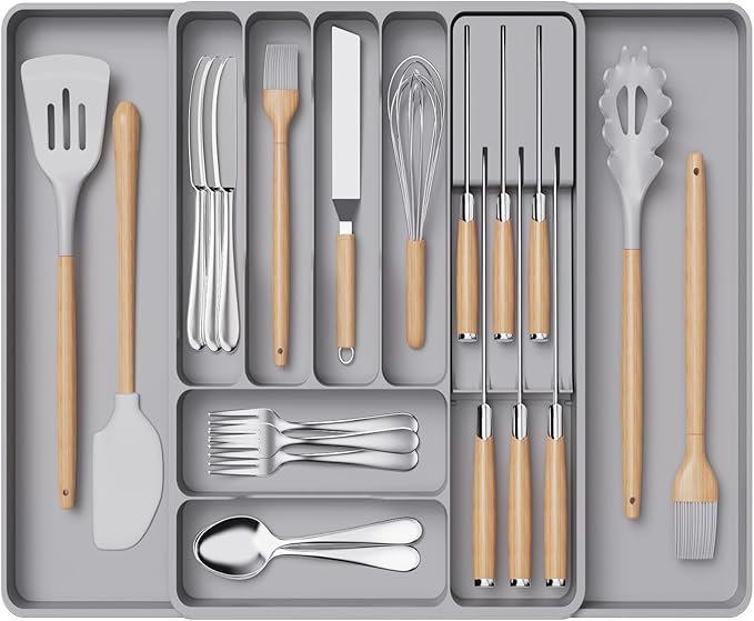 Lifewit Silverware Organizer for Kitchen Drawers, Expandable Utensil Tray with Removable Knife Block, Adjustable Cutlery and Flatware Holder, Plastic Spoon Forks Holder Storage Divider, Large, Gray
