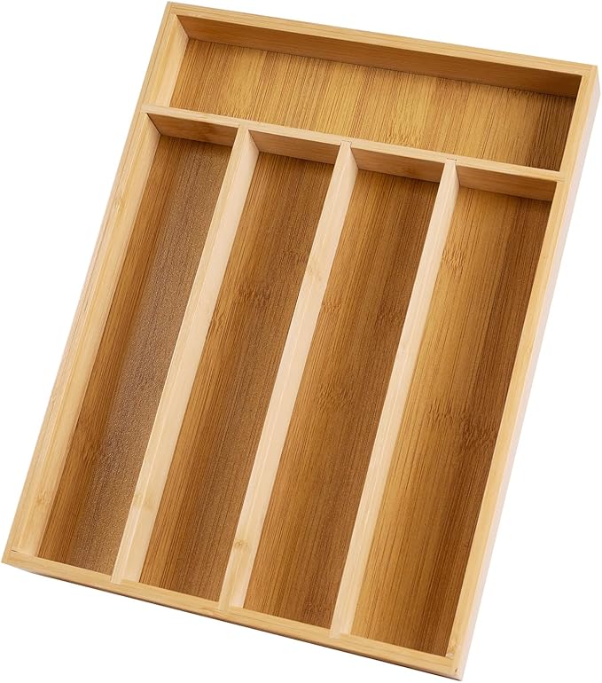 - 【 Must Have Kitchen Tools 】This utensil drawer organizer is made of high-quality bamboo. The product has a total of 5compartments, which are very suitable for storing your cutlery, can help you separate knives, forks, spoons, and other cutlery, is a perfect kitchen helper, and can keep your kitchen and dining room clean and beautiful!