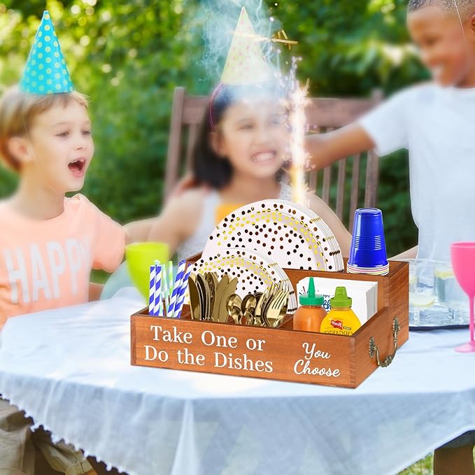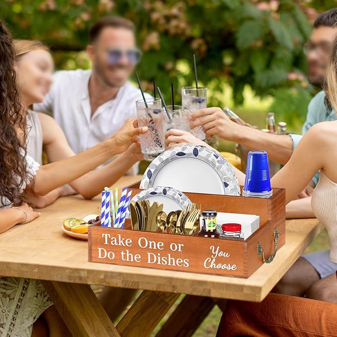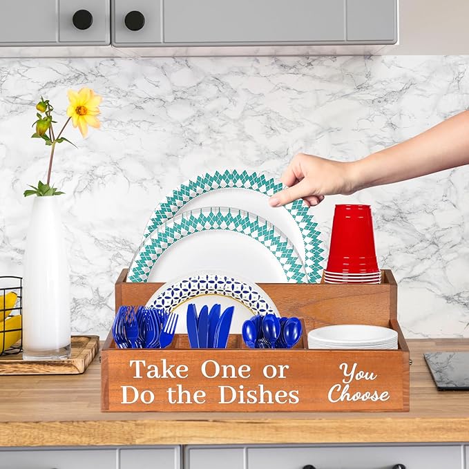 - Best Gift Choice & Service Guaranteed:Do you want to surprise your friends, relatives, neighbors, and mother? Our picnic caddy for plates and utensils will be the best gift at housewarming, Mather’s Day, Thanksgiving Day, Christmas or birthday, our farmhouse utensil holder for party will brighten their eyes when your friends and family pick up their plates from the wooden kitchen paper plate caddy organizer. Any issues, please feel free to contact us, and we will provide the best service to you!