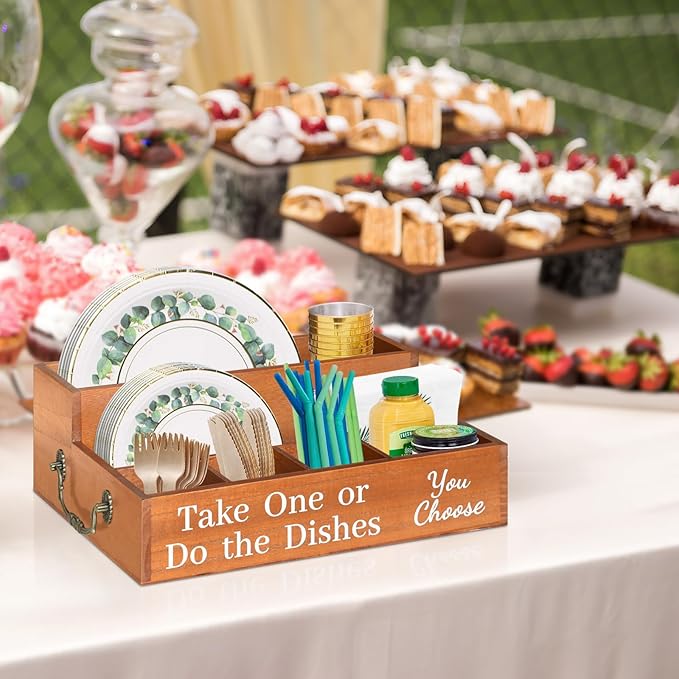 - Multi-Functional Utensil Holder & Wide Application: Our utensil caddy for parties and paper plate holder is not only great for holding flatware, it can also be used for organizing small objects such as office supplies, tools, and more. Our wooden paper plate holders for counter is easy to carry anywhere and is ideal for picnics, barbecues, camping, parties, buffets, BBQ, RVs, weddings, holiday gatherings, and other outdoors scenarios.