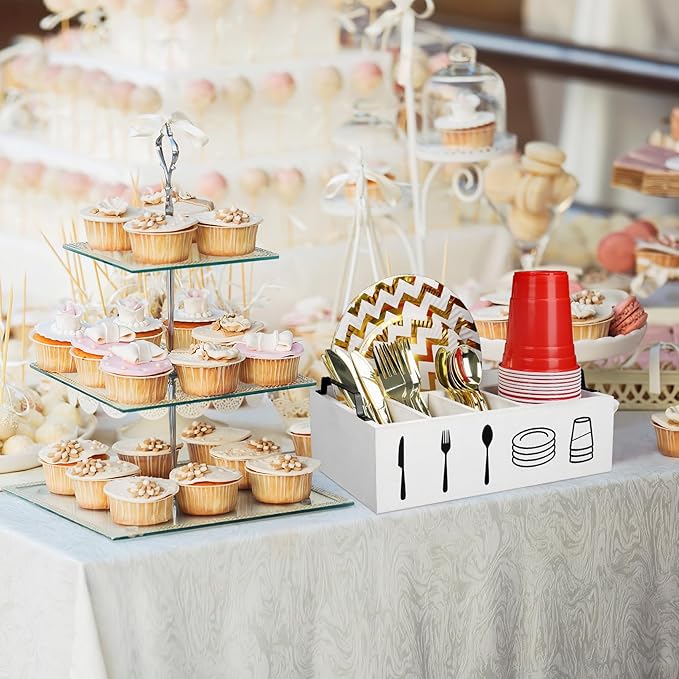 - 【Stay Away From Clutter 】- Our utensil organizer for countertop has 5 compartments designed for knives, forks, spoons, napkins. The paper cup box can hold all kinds of cups you need.The organizer can also be used as a small assistant at the coffee station, and the large space can store disposable paper cups, straws, coffee balls, sugar packets, etc.