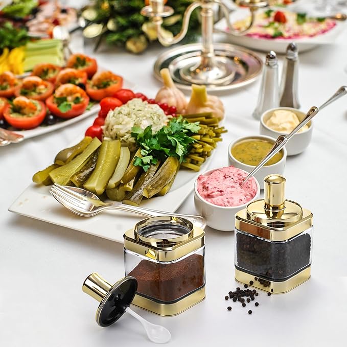 - Comes with Lid and Spoon: This gold salt and pepper shaker is designed with a notch on the lid which can accommodate the spoon. It's convenient for you to dig out the seasoning! The lid with a rubber ring also prevents moisture and dust.