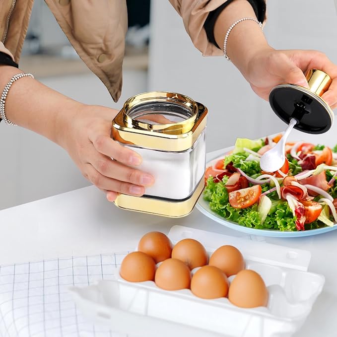 - Elegant Design: These salt and sugar container sets are covered with a bright gold color, which looks very exquisite, and adds a touch of elegance to your table. The high transparency of the glass bottle body allows you to see what is inside at a glance.