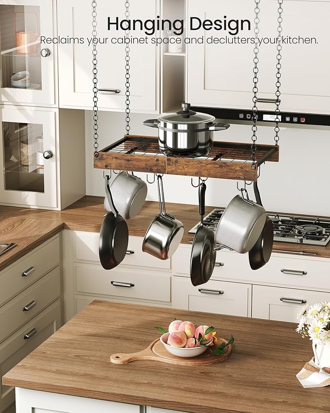 - Handy Storage: The pot rack comes with 12 detachable heavy-duty hooks and a central iron frame with mesh that not only hangs various pots and pans for easy access, but also holds additional pots above it. It’s great to display your cookwares and boost kitchen organization