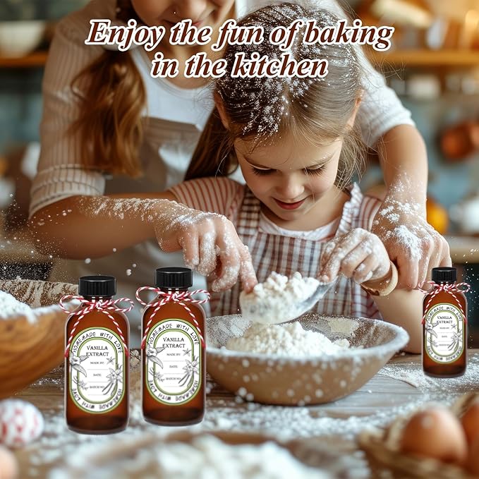 - Sufficient Quantity: Each set includes 12 4 oz glass vanilla bottles, so you can easily store and organize your vanilla extracts or homemade recipes with ease. And 12 exquisite vanilla stickers and a roll of red and white cotton rope, enough for meet all your storage and sharing needs. Whether used for decoration or tying things together, these stickers and cotton rope can provide convenience.