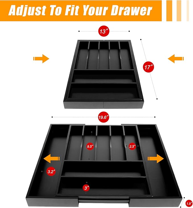 - ✅【Expandable - fit most kitchen drawers.】Our large utensil silverware drawer organizer flatware cutlery tray are adjustable in width, expanding from 17"x13" to 17"x19.6" as needed, with a depth of 1.9" . The utensil silverware drawer organizer is crafted from natural bamboo that has been grown for over 4 years. Each silverware drawer organizer made of bamboo is meticulously handcrafted by seasoned artisans to ensure a smooth, smooth surface. You can confidently allow your family or children to use our silverware drawer organizer.