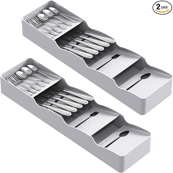 Lifewit Compact Flatware Drawer Organizer, Narrow Silverware Tray for Kitchen Drawers, Plastic Cutlery Holder for Spoons, Forks and Knives, Utensils Storage Organization, 2 Pack, Gray