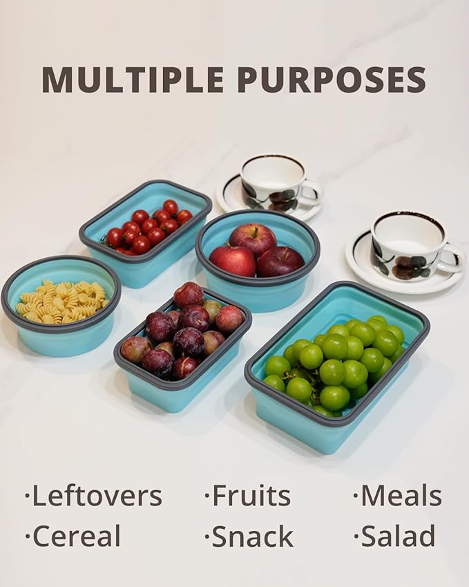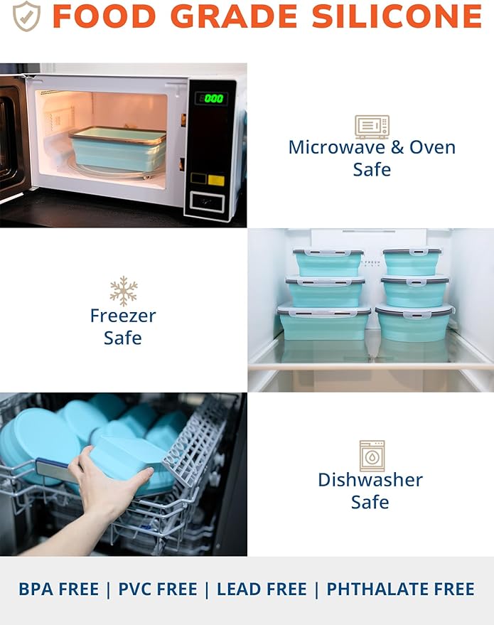 - SUPER COMPACT and EASY TO CARRY - These collapsible food storage containers are are lightweight and easy to carry when traveling, hiking, or carrying food on airplanes. Take up much less space than normal containers.