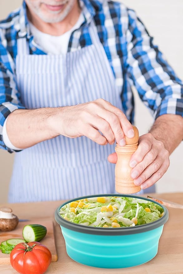 - FOOD GRADE MATERIAL - The whole set of foldable lunch box is made from 100% FDA compliant non-toxic, BPA free, food grade silicone. Easy to clean and nothing stick to the silicone. (Do not put the lid in the dish washer)