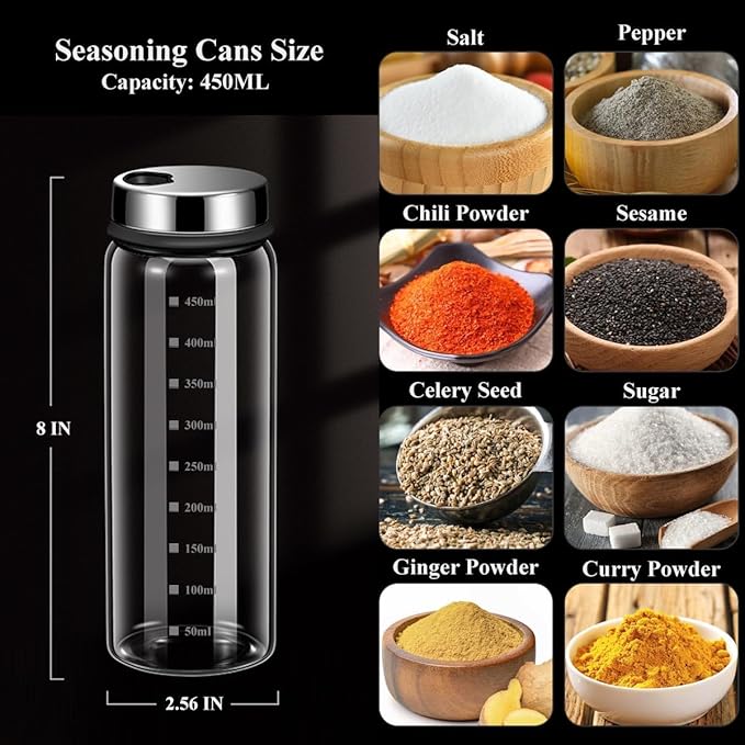 - 450ML capacity glass bottle with a wide opening, easily refilled and offers ample space for your favorite seasoning or spice, resulting in less frequent refills.Complete with a circle of silicone pad on the bottom, for slip resistant